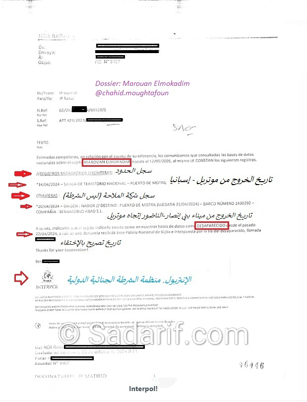 تطرقنا لقضية اختفاء مروان لمقدم قبل أسابيع ونتابع القضية بتنسيق وتواصل دائم مع ” جمعية مختفون” ممثلة في شخص الرئيس الأستاذ سليمان شهيد الذي وافانا بنسخ البلاغات الصادرة عن النيابة العامة بالناظور والإنتربول.