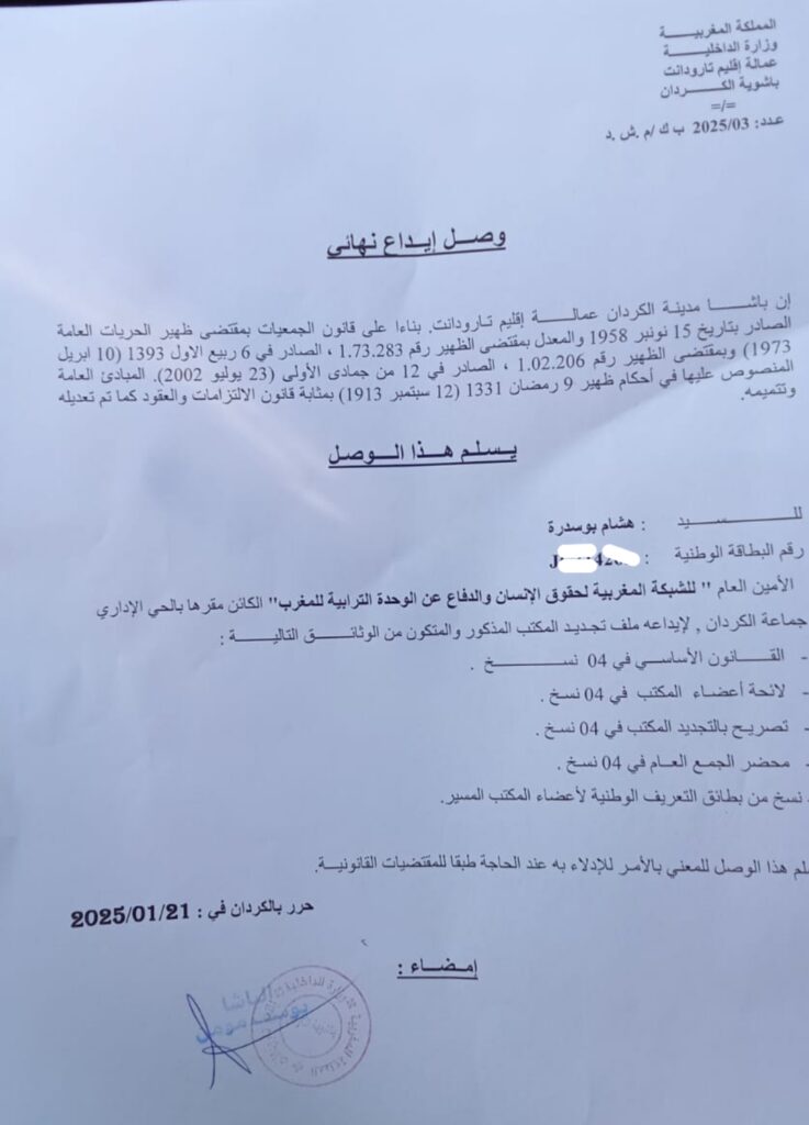 في خطوة تعزز المشهد الحقوقي بالمغرب، تسلم يوم الثلاثاء 21 يناير 2025 السيد هشام بوسدرة، الأمين العام للشبكة المغربية لحقوق الإنسان والدفاع عن الوحدة الترابية للمغرب، الوصل النهائي للشبكة من طرف باشا مدينة الكردان بإقليم تارودانت.