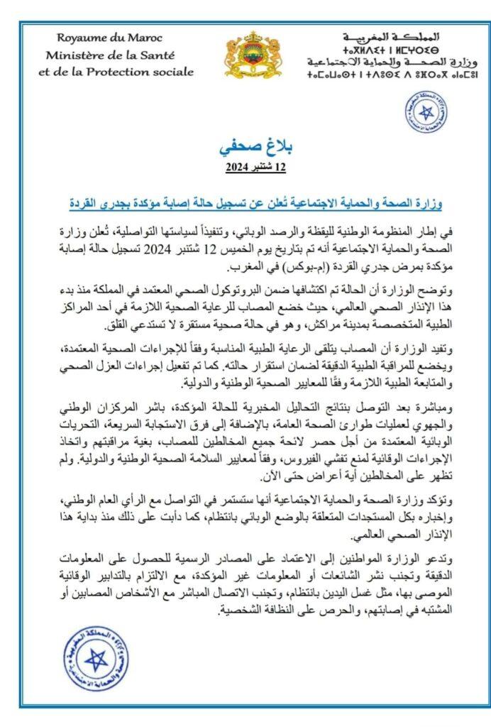 وأوضح بيان الوزارة أن المصاب يتلقى الرعاية الصحية المناسبة في مركز طبي متخصص بمدينة مراكش، وحالته الصحية مستقرة ولا تستدعي القلق. كما تم تفعيل جميع إجراءات العزل الصحي والمتابعة الدقيقة، وفقًا للمعايير الوطنية والدولية.